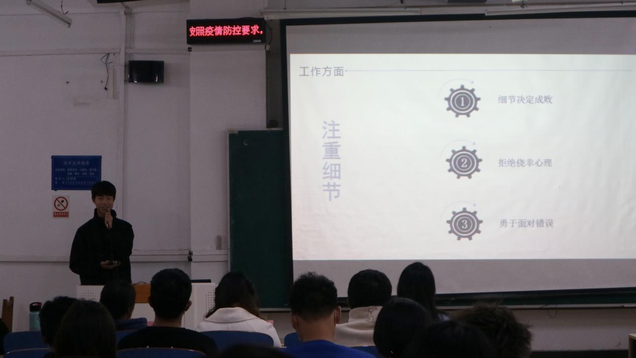 11月1日,公司在三教B101召开以“抒言启行、携手并进”为主题的新老生交流会。2019级信管1班句景怡、2020级信管2班毛泽昀、2020级工程管理1班王媛媛、2020级信管2班李刻欣、2020级工程管理2班齐晓龙受邀参加此次交流会,2022级部分员工代表参加,其他员工通过腾讯会议平台观看。