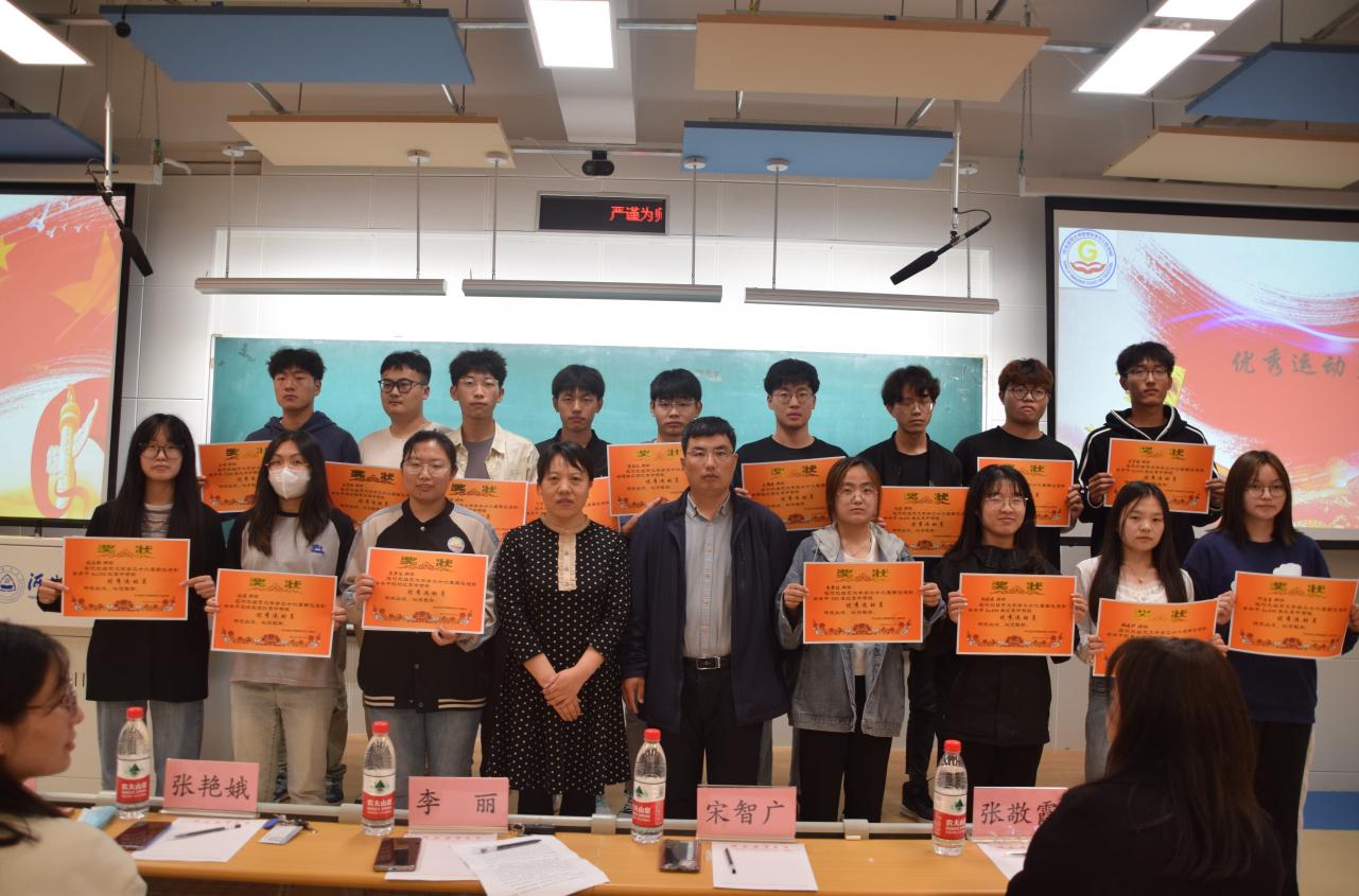 5月8日,公司在三教A201教室举行运动会表彰大会,党委副书记李丽、专职组织员宋智广,辅导员王芳、张艳娥、张敬霞及全体运动员参加。