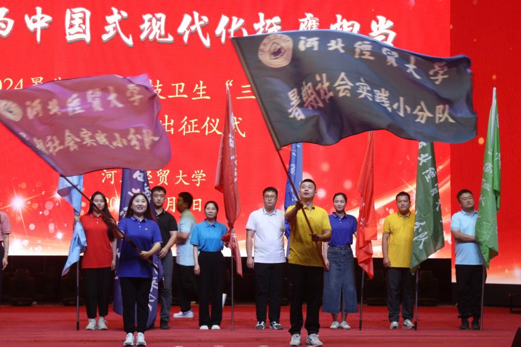 7月7日下午,学院实践小分队在校礼堂参加出征仪式,院团委书记梁旭辉代表实践团队接受出征旗帜。