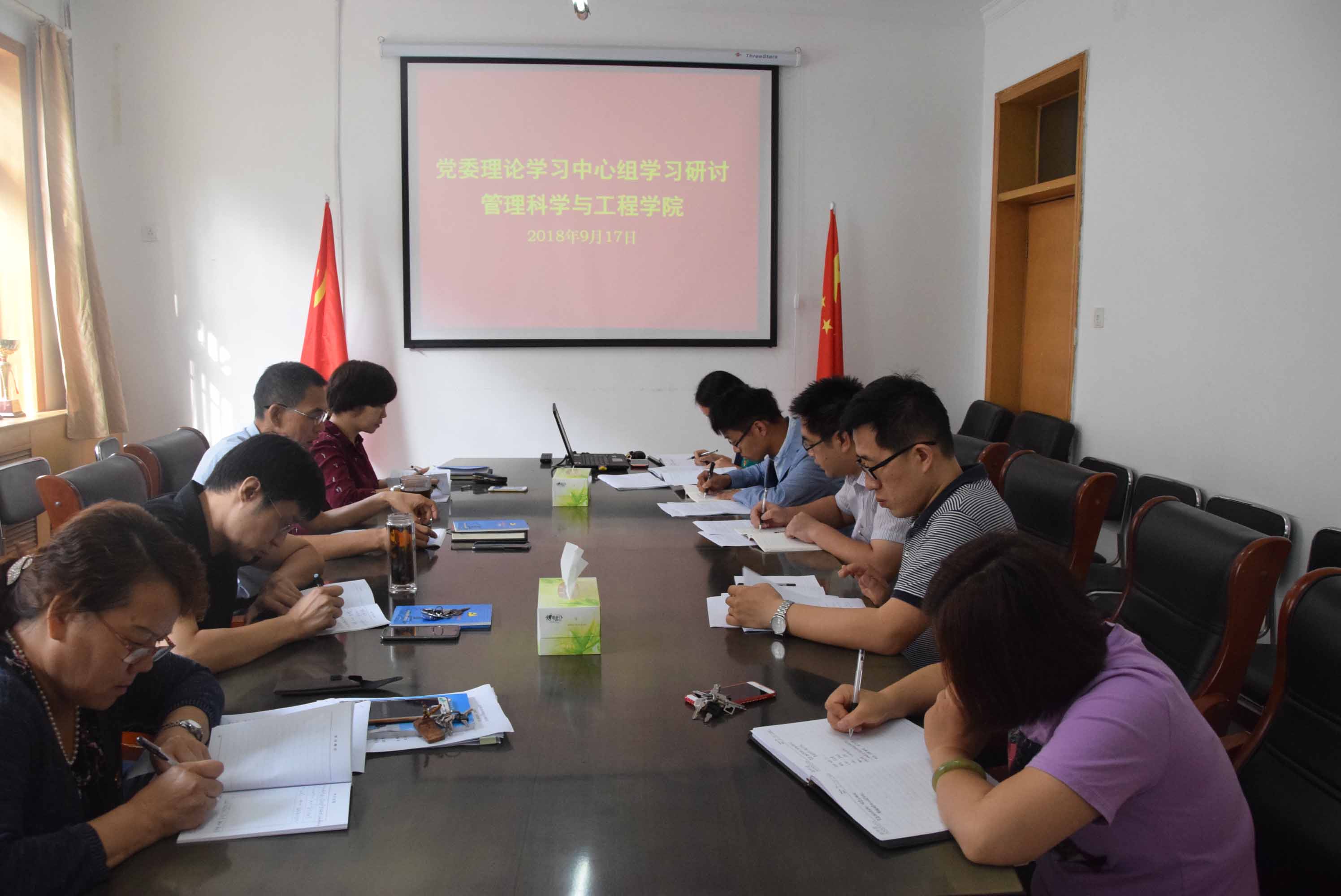 2018年9月17日上午,管理科学与工程公司党委理论学习中心组开展学习研讨活动,集体学习《地方党政领导干部安全生产责任制》和《河北省党政领导干部生产责任制实施细则》。会议由公司党委书记高永芳主持,全体党委委员参加,各教学系系主任、班主任列席。