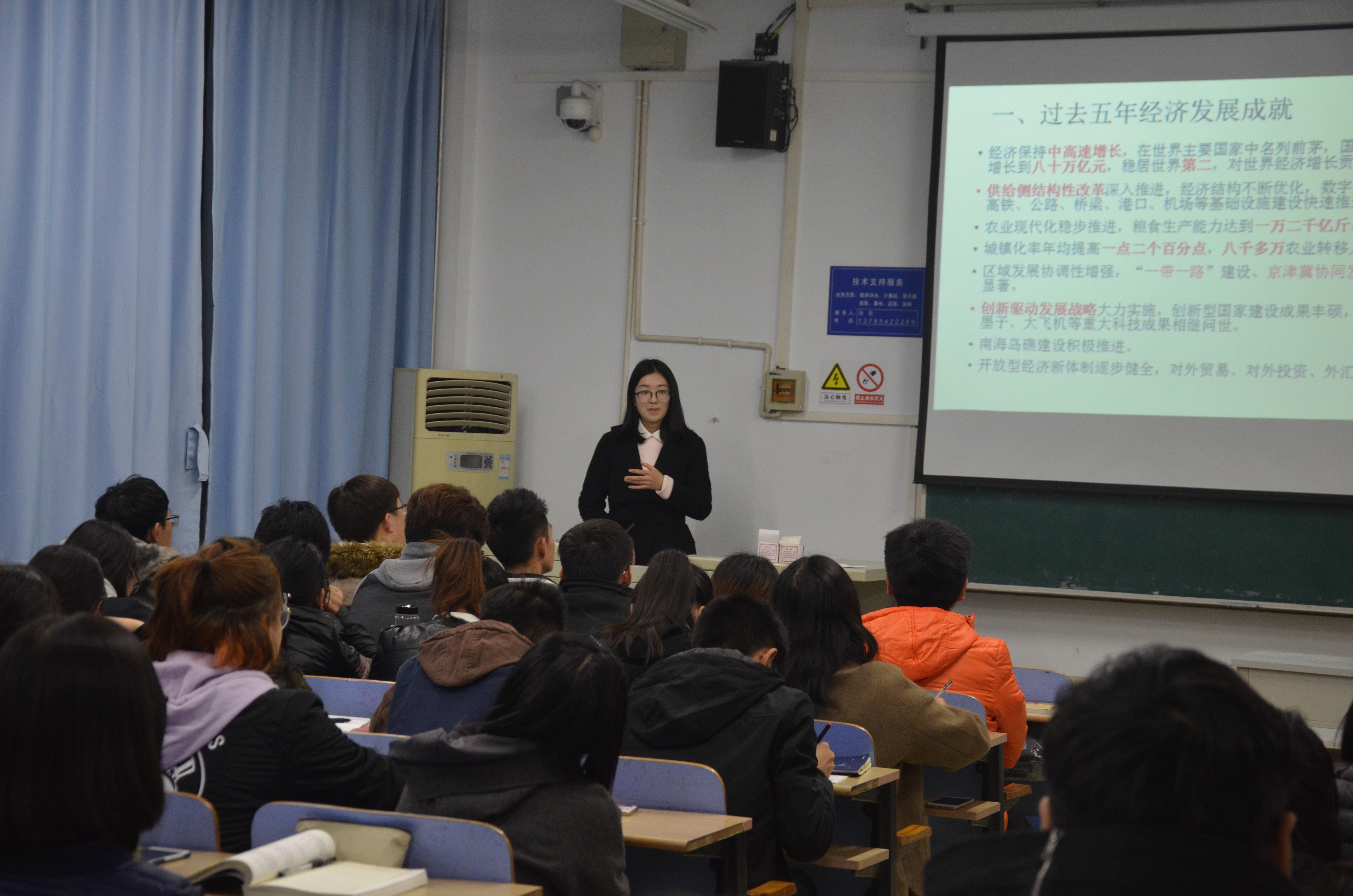 郝丽丽从经济发展的角度向与会员工宣讲了党的十九大精神。她结合党的十九大报告,阐述了我国过去五年的经济发展成就,以及我国经济发展过程中存在的主要困难和挑战,并对我国的经济体制进行了讲解。郝丽丽还就十九大报告讲解了我国经济发展的新目标,分析了我国六个应对困难和挑战的经济发展策略,展示了六种马克思主义立场观点。在讲座最后的互动环节中,郝丽丽对同学们提出的问题一一进行了认真解答。