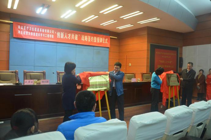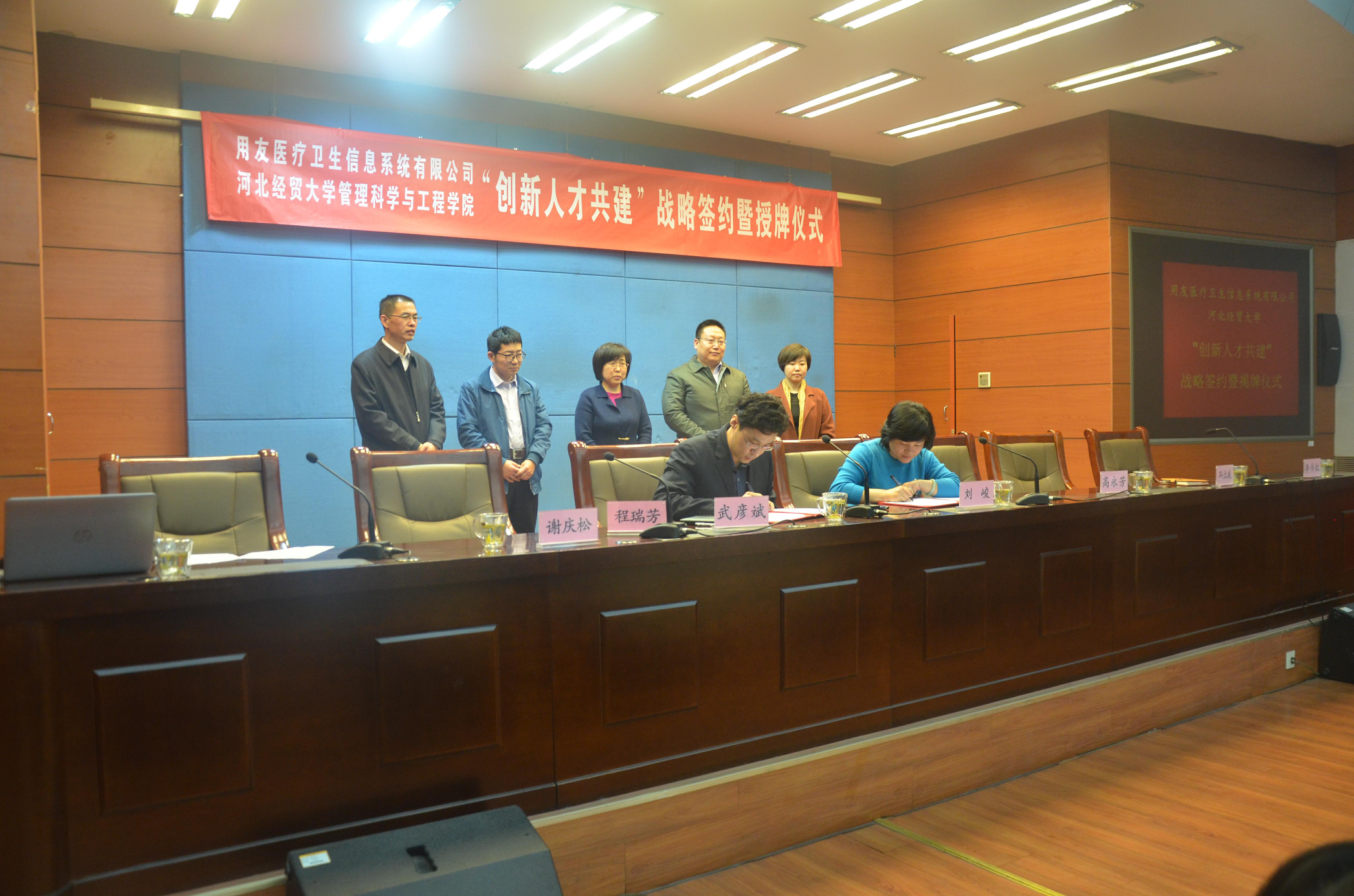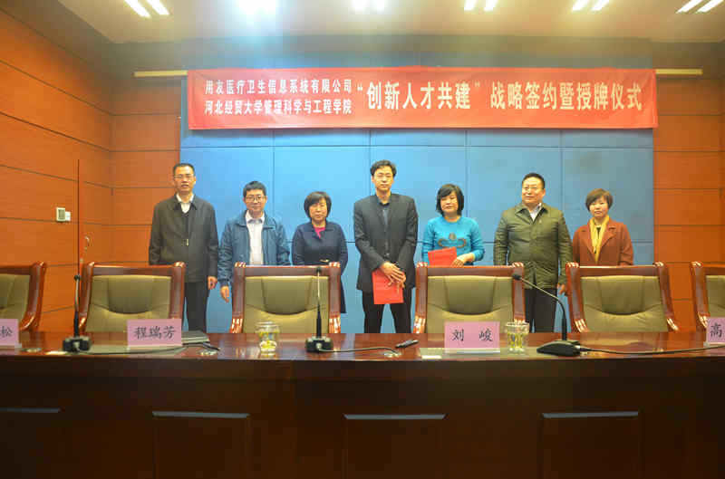 2018年3月12日下午,公司在视频会议室举行“创新人才共建”战略签约暨揭牌仪式。用友医疗卫生信息系统有限公司副总裁刘峻,用友集团人力资源部经理谢庆松,教务处处长程瑞芳教授、副处长孙立威、学院领导班子出席。仪式由学院经理武彦斌主持,学院全体教师及部分员工参加.