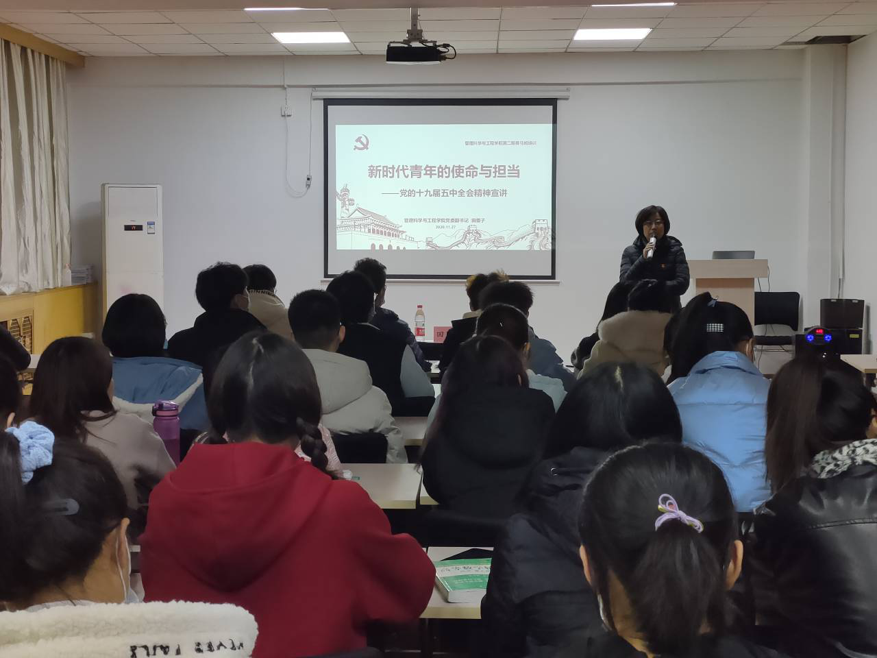 11月27日晚,公司党委副书记田蓁子在第一教学楼408教室为学院第二期青马班学员讲授了“新时代青年的使命与担当”的专题课,宣讲党的十九届五中全会精神。