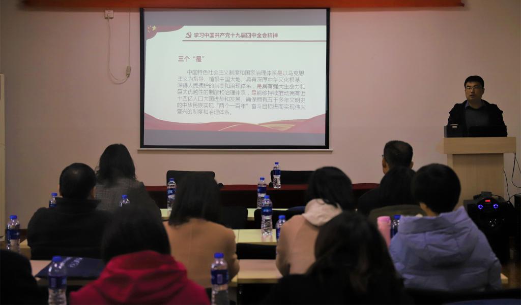 会前,高永芳传达了关于做好公司党的十九届四中全会精神宣讲安排的通知。学院向全体教职工发放了《党的十九届四中全会<决定>学习辅导百问》一书。宋智广向全体教职工传达了学校关于学习宣传贯彻党的十九届四中全会精神的要求,带领与会教师以原原本本学原文的方式共同学习了《中共中央关于坚持和完善中国特色社会主义制度、推进国家治理体系和治理能力现代化若干重大问题的决定》。