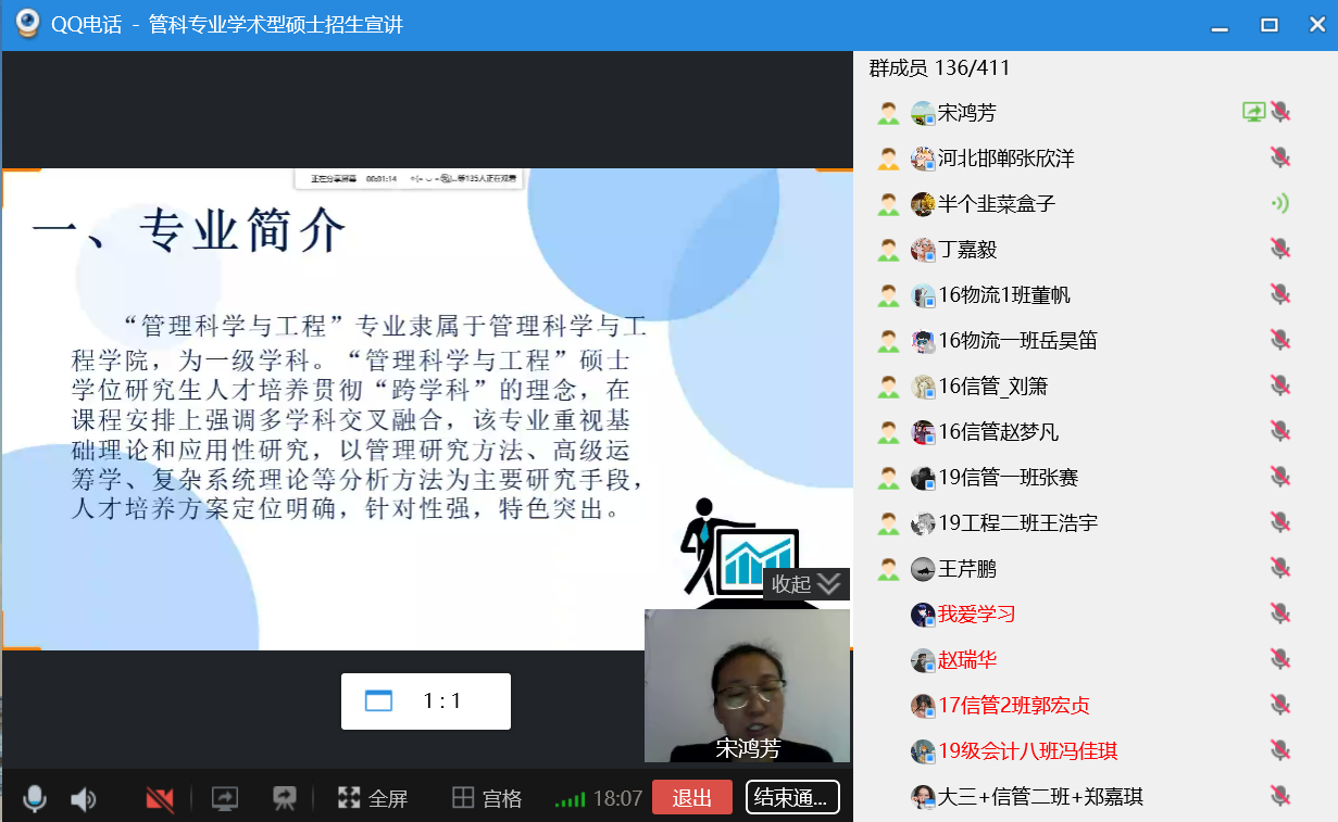 7月10日,公司在线上举办2021年管理科学与工程专业第二次学术型硕士招生宣讲会,硕士生导师宋鸿芳副教授以及研究生辅导员张艳娥老师出席本次会议。