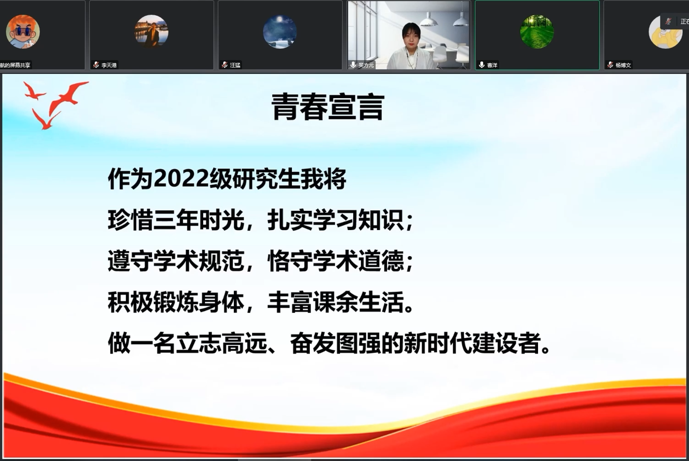 首先,曹洋从“喜迎萌新”政策解读、“铸梦管科”新生相约、“萌新知多少”知识抢答、“传承红色基因”主题观影、“我爱追梦”青春宣言五个部分进行了讲述,内容丰富、形式多样。第一部分解读了《sunbet申搏员工违纪处分办法》、《sunbet申搏研究生学籍管理规定》,提醒员工遵守学校的各项规定、注意宿舍用电安全;“铸梦管科”新生相约模块主要由新生代表发言,分享了自己的感悟;“萌新知多少”知识抢答环节通过独特新颖的方式让新生了解了党史知识以及学院的基本情况;“传承红色基因”主题观影通过师生共同录制视频“习语播报”短片,让红色思想展现在师生的视野中。随后,参会辅导员就本次主题班会展开了热烈的讨论与交流。