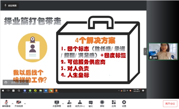4月12日下午,公司邀请北京邮电大学刘佳老师通过腾讯会议做择业就业指导讲座,此次讲座由公司党委副书记李丽主持,学院全体毕业生及部分大三员工参加。
