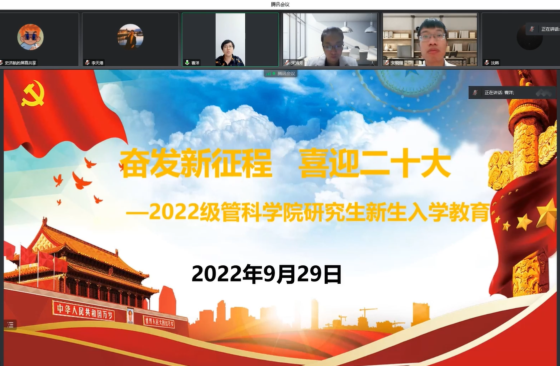 9月28日,学院学科办主任、研究生辅导员曹洋在腾讯会议线上召开了“奋发新征程 喜迎二十大-2022级管科学院研究生新生入学教育”主题班会。本次班会主要包含五项内容,即“喜迎萌新”政策解读、“铸梦管科”新生相约、“萌新知多少”知识抢答、“传承红色基因”主题观影、“我爱追梦”青春宣言。通过主题班会,进行理想信念教育、校规校纪教育、安全教育、科学道德与学风教育,帮助新生增强使命担当、开启学业规划,更好适应研究生生活。
