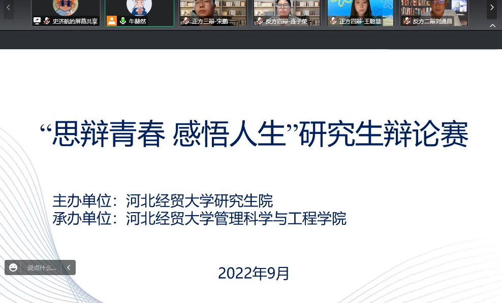 9月中下旬,管科学院承办“思辩青春 感悟人生”研究生辩论赛(研究生学院主办),全校共有12支代表队参加了比赛,历时两个星期。此次辩论赛涉及时事问题、热点事件、人生哲学等多个辩题,紧扣时代发展脉搏,给予同学们锻炼的平台和思考的空间,让大家在充分展示青春风采的同时,进一步提升语言表达、知识储备、逻辑思维、科学研究等方面能力。