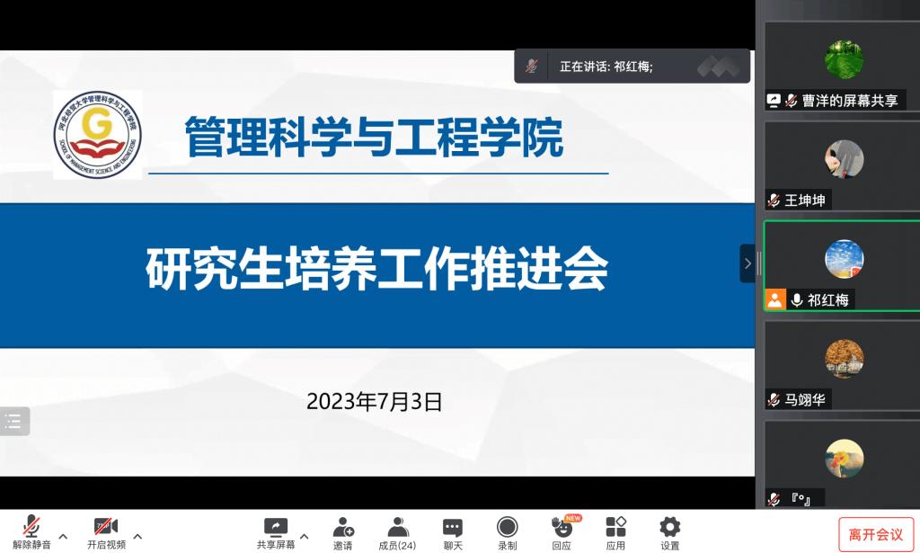 祁红梅从招生、管理、培养和学位工作,四个方面分析了学院研究生教育现状和面临的挑战,布置了暑期重点工作。她指出推进研究生教育高质量发展:一是以立德树人为使命,规范培养过程管理,导师定期与研究生开展学术研讨或进度汇报活动,实时掌握研究生学习和科研进展;二是以新财经教育改革为主线,鼓励师生外出开展移动课堂、研学等活动,进一步拓宽公司研究生的视野;三是以过程管理为抓手,加强论文开题、预答辩、送审及答辩等培养环节的审查力度。