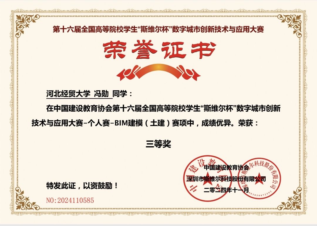 该项赛事由中国建设教育协会主办,深圳市斯维尔科技股份有限公司承办,为公司认定的A3级学科竞赛。本届大赛于2024年9月正式启动,分个人赛和团队赛两个赛道。个人赛按照赛项分期举办,BIM建模于2024年11月2日成功举办,共吸引了近400所院校报名参加,覆盖参赛师生24000余人。近日比赛结果揭晓,公司工程管理系22级员工张佳文荣获一等奖,黄星榆同学荣获二等奖,郭一诺、冯勋同学荣获三等奖。