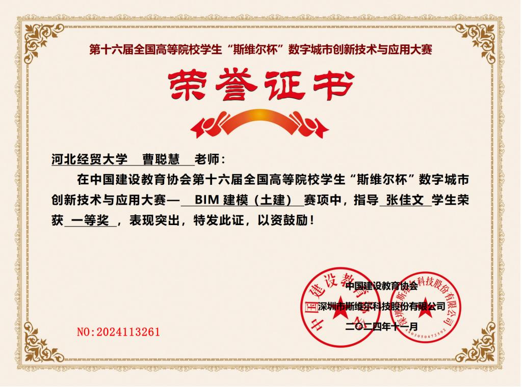 近日,第十六届全国高等院校员工“斯维尔杯”数字城市创新技术与应用大赛个人赛获奖名单公示,工程管理系张敏、曹聪慧老师指导员工参加了BIM建模赛项比赛,获全国一等奖1项、二等奖1项、三等奖2项。