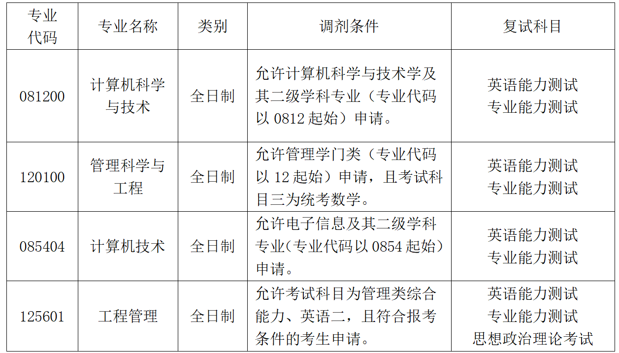 注意:125601工程管理(全日制)调剂条件:截至2025年9月入学时,大学本科毕业后有3年以上工作经验的人员;或者获得国家承认的高职高专毕业学历或大学本科结业后,符合相关学业要求,达到大学本科毕业生同等学力并有5年以上工作经验的人员;或者获得硕士、博士学历或学位后有2年以上工作经验的人员。