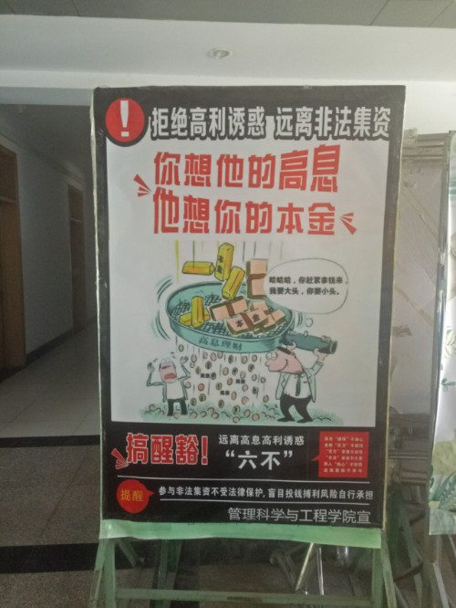 近日,为提高员工识别防范能力,自觉远离和抵制非法集资,管理科学与工程学院展开了关于防范非法集资的系列宣传活动。