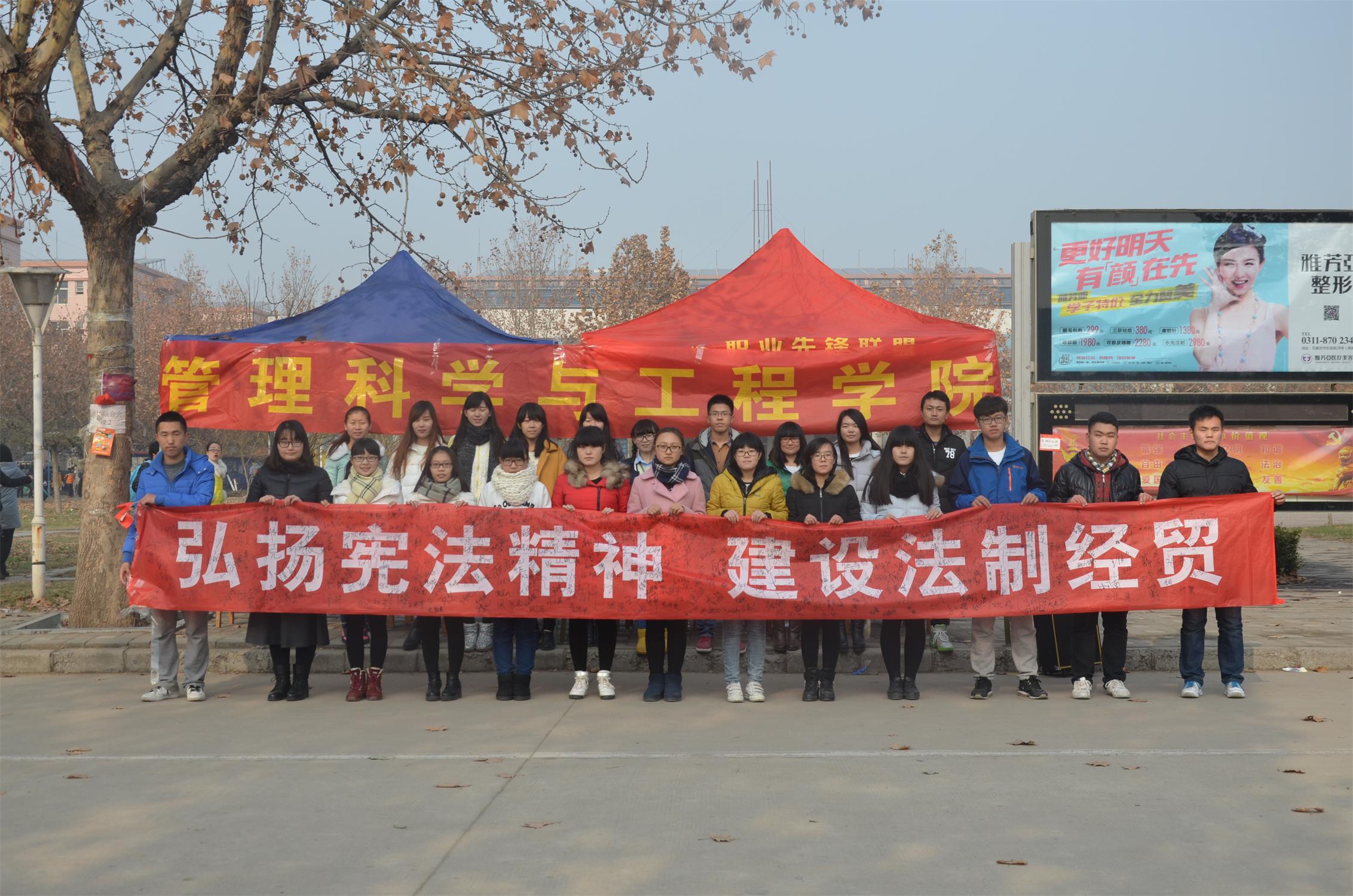 为增强法制意识,普及宪法知识,12月11日,管理科学与工程学院在韶华路举办以“弘扬宪法精神,建设法制经贸”为主题的宣传活动。