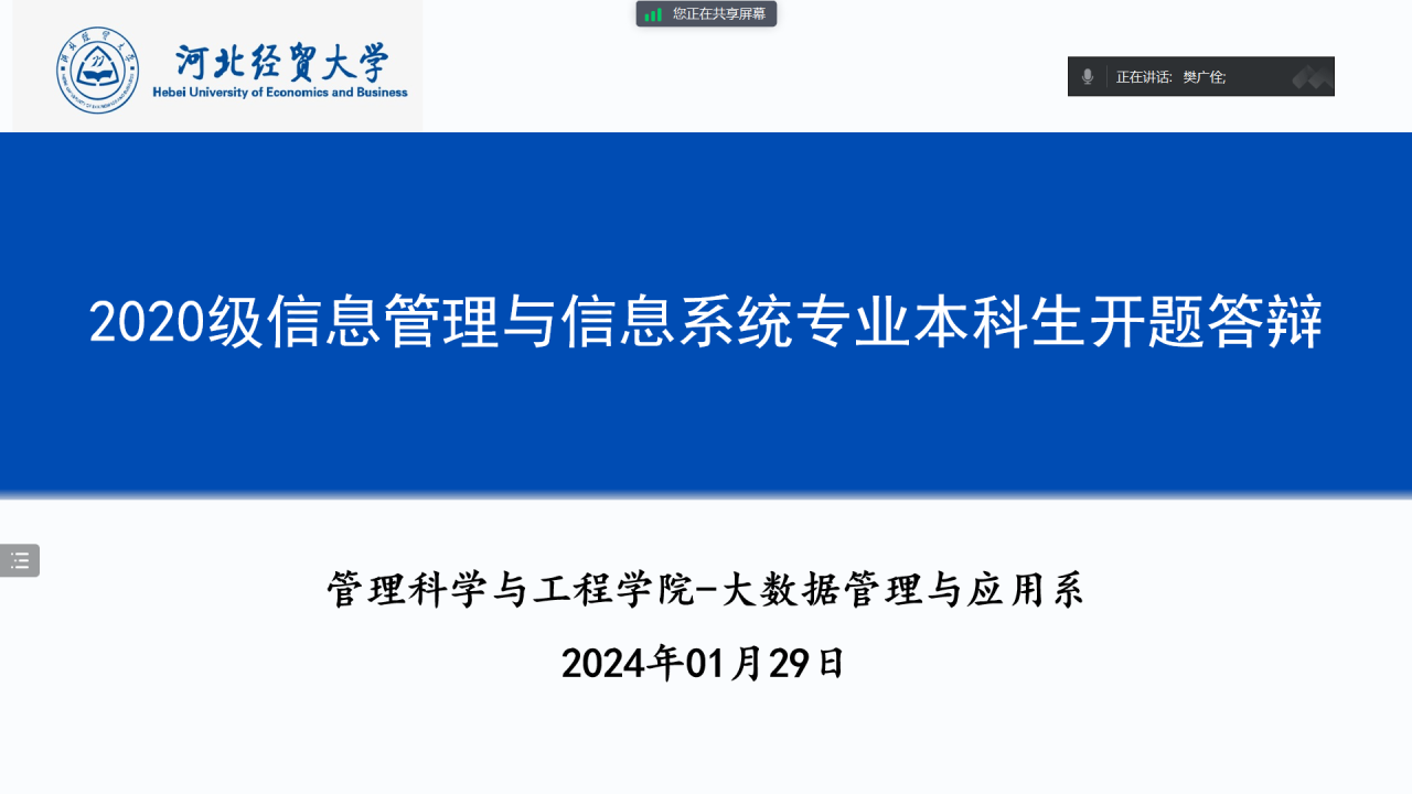 为加强大数据管理与应用系本科毕业论文工作的全链式管理,提升毕业论文水平,提高毕业生培养质量,我系按照学校2024届本科毕业论文工作计划及公司本科毕业论文质量提升工作推进会的工作要求,于2024年1月29日下午分两组举行了2024届本科生毕业论文线上开题报告答辩。