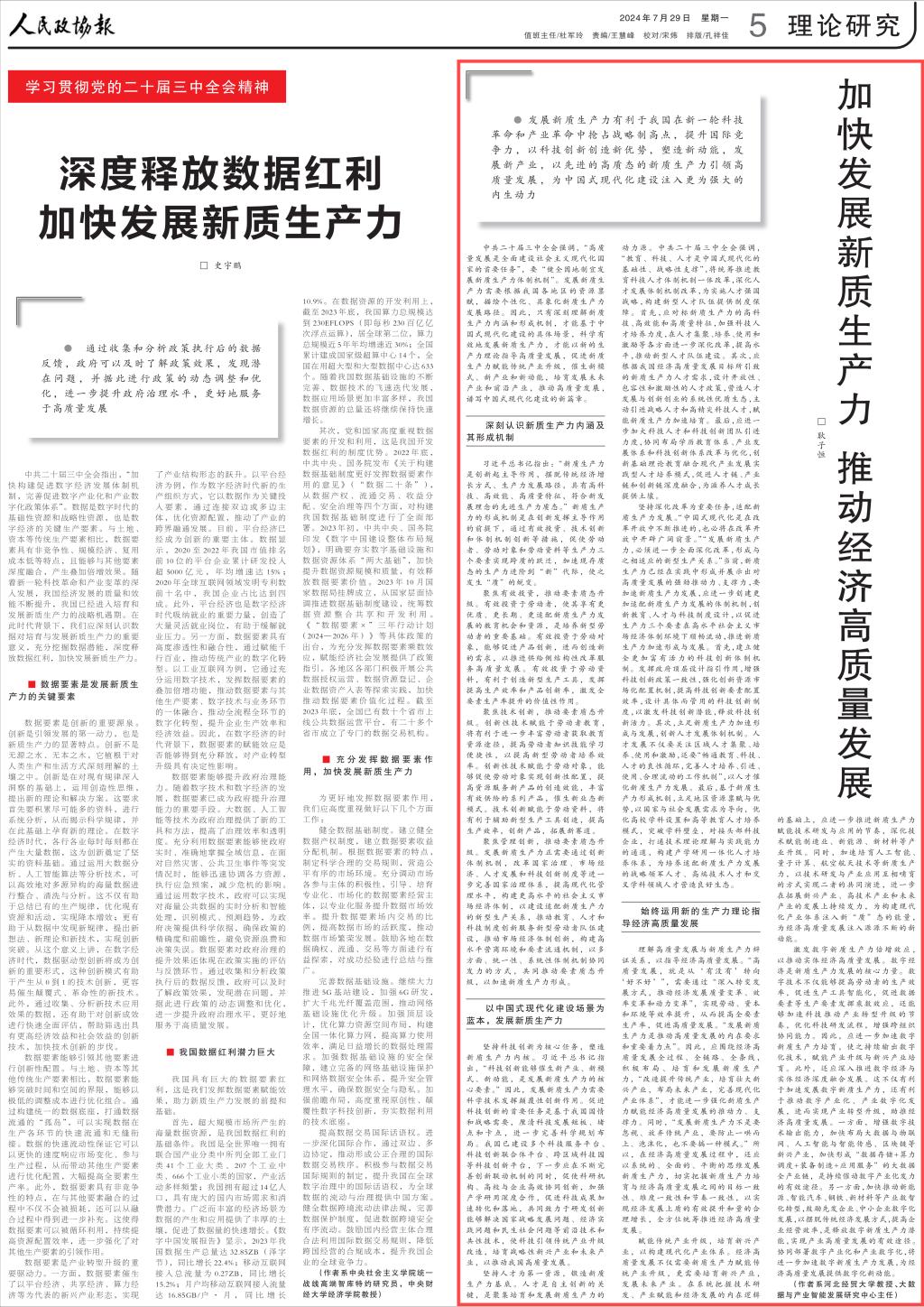 2024年07月29日,《人民政协报》第5版(理论研究版)刊发公司sunbet申搏耿子恒教授的“学习贯彻党的二十届三中全会精神”专题署名文章《加快发展新质生产力推动经济高质量发展》。