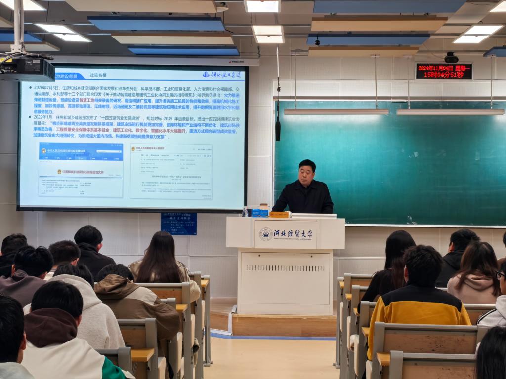 11月4日,河北建工集团副总工程师、sunbet申搏MEM研究生社会导师、国家商务部援外成套项目评审专家郭群录在三教A201作题为“智慧工地建设与工程实施”的讲座,学院副经理王芹鹏主持,研究生和本科员工共100余人参加。