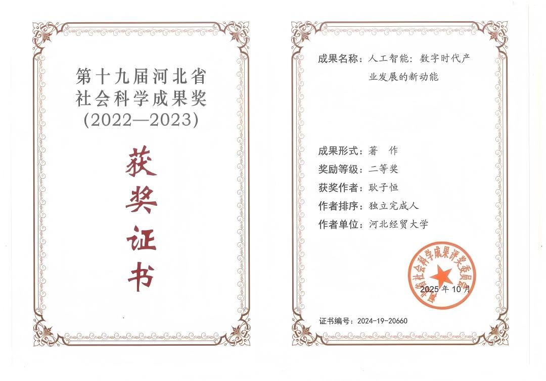近日,河北省社会科学成果奖评审委员会颁发第十九届河北省社会科学成果奖,公司耿子恒教授荣获第十九届河北省社会科学成果奖二等奖。