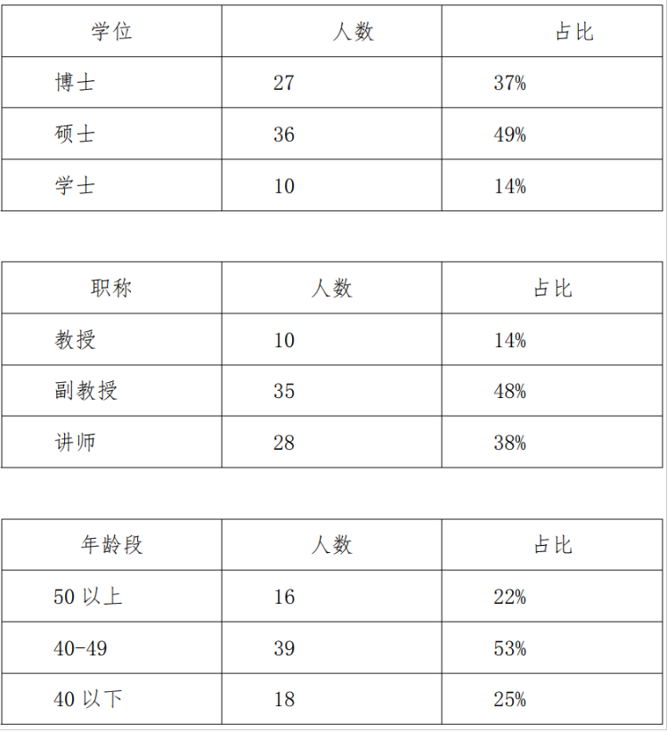 截止目前,示范中心共有教师73名,其中高级职称45名,占比61%。博士27名,占比37% 。